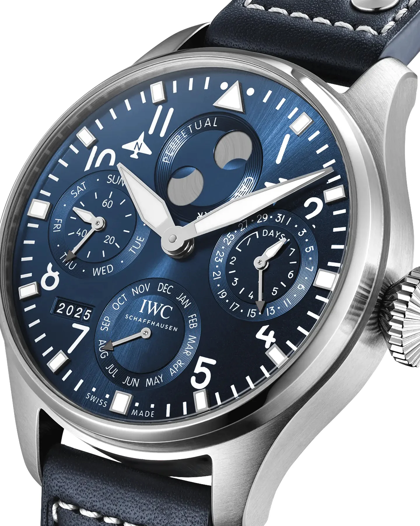 The Big Pilot’s Watch Perpetual Calendar in stainless steel with a blue dial continues the long-standing tradition of perpetual calendar watches in the Big Pilot’s collection.