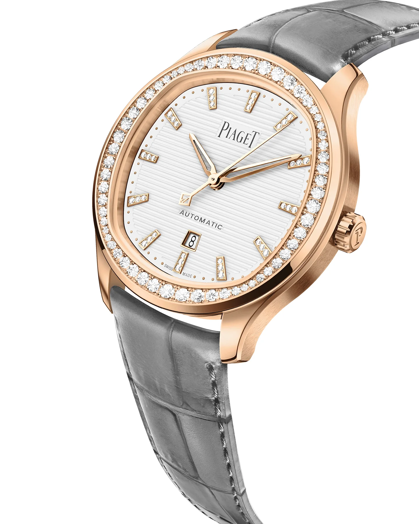 Piaget Polo Date watch, 36 mm. Case in 18K rose gold set with 60 brilliant-cut diamonds (approx. 0.97 ct). Dial with hour markers in 18K rose gold set with 36 brilliant-cut diamonds (approx. 0.08 ct). Sapphire crystal case back. Interchangeable strap. Manufacture 500P1 self-winding mechanical movement.